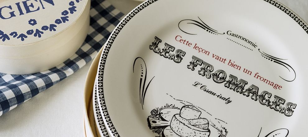 Endormis depuis les années 1970 parmi les milliers de modèles que la Faïencerie de Gien conserve précieusement, les motifs vintage qui ornent ces assiettes ont été remis au goût du jour pour un résultat très actuel. Un clin d’oeil rétro qui s’accompagne d’une touche d’humour avec une petite phrase différente sur chaque assiette. Ces adages et expressions bien connus nous rappellent que les fromages de France font partie d’un univers culturel partagé.