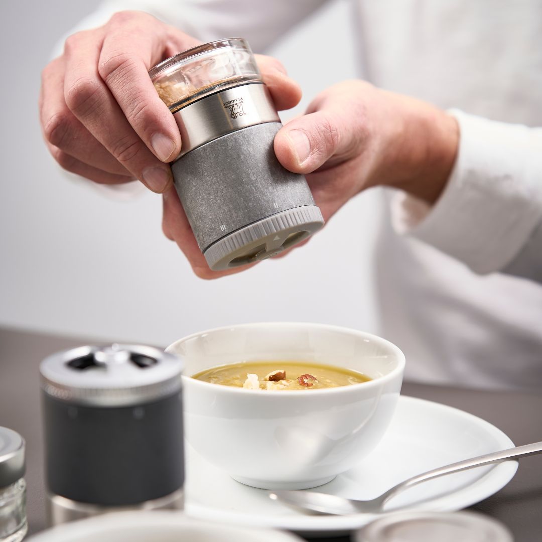 le moulin à sel Maestro est l'instrument parfait pour partir à la découverte du monde du sel. D’un simple geste, le moulin passe d’une variété de sel, à l’autre.