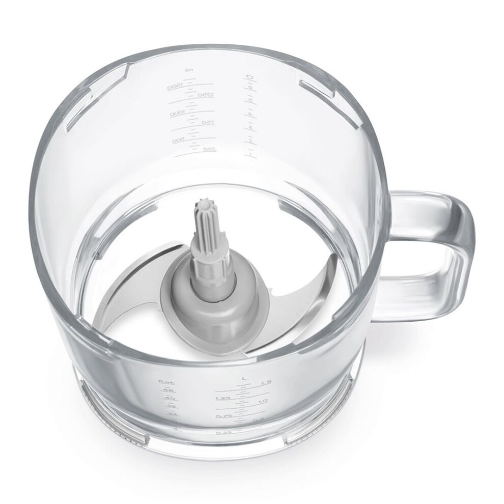 Cet outil de cuisine multifonction 5 en 1 est parfait pour trancher, hacher, râper ou fouetter. Le bol en Tritan™ peut contenir 1.5L et possède une base antidérapante. Le bol est compatible avec le lave-vaisselle et accompagné d'un poussoir sans BPA.