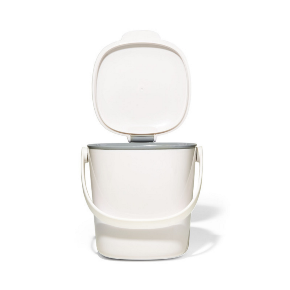 Le bac à compost de cuisine blanc OXO est un composteur compact, hermétique et sans odeur.