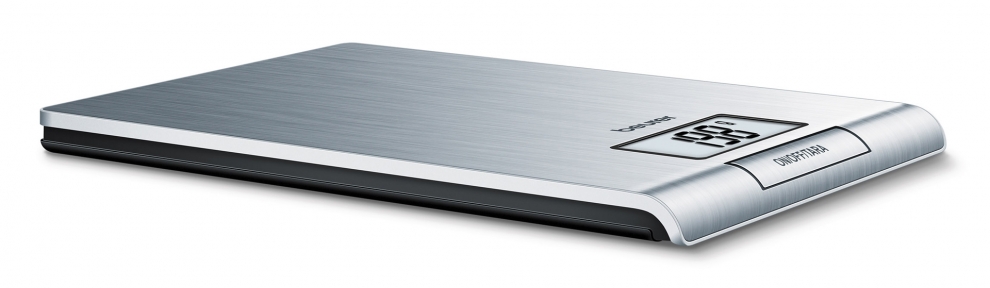 Balance de cuisine super plate avec plateau de pesée en acier inoxydable brossé.