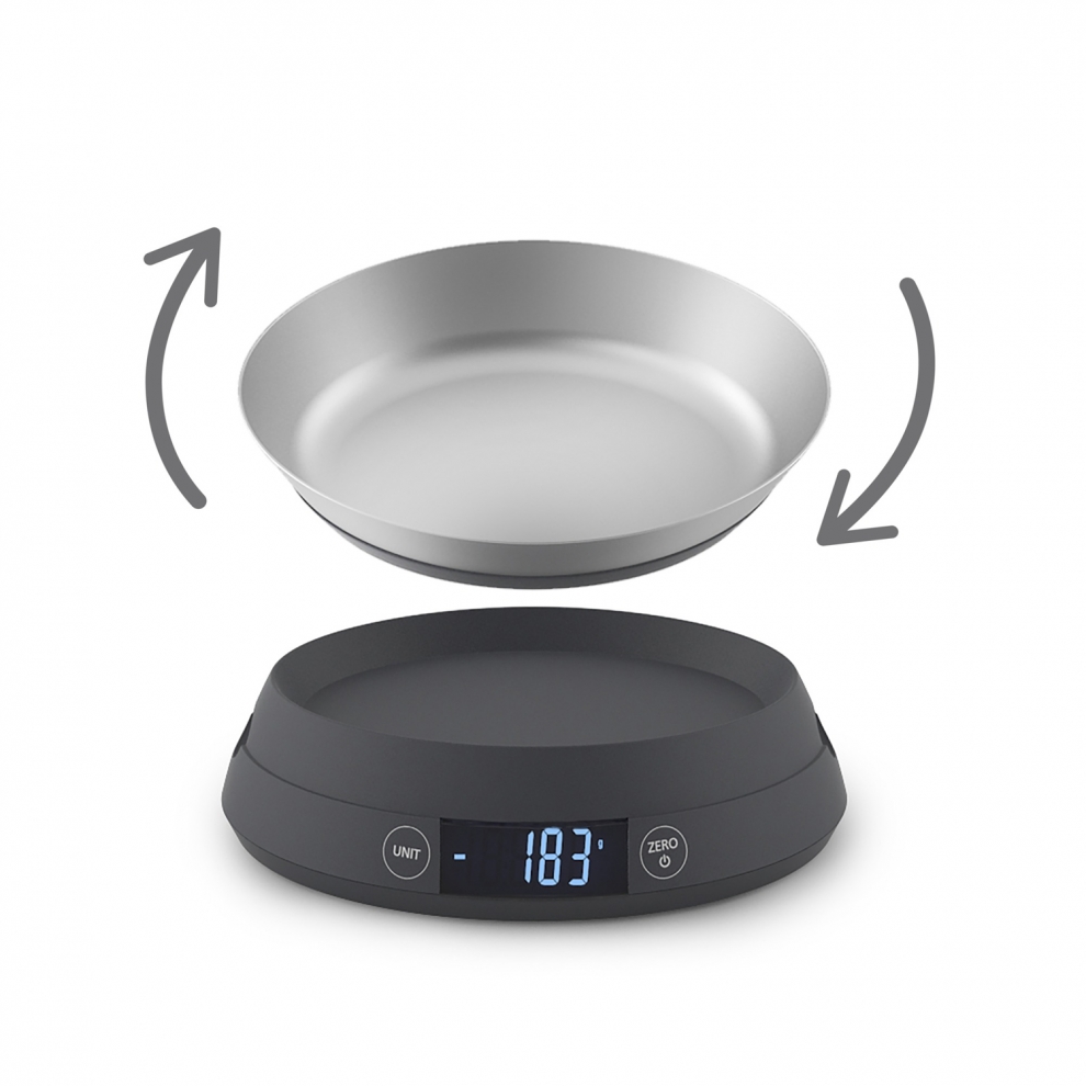 Cette balance très versatile vous offre deux solutions pour peser les aliments. Vous pouvez soit poser les aliments sur la surface de la balance ou bien inverser le couvercle pour créer un bol mesureur pour les aliments en vrac ou liquide.