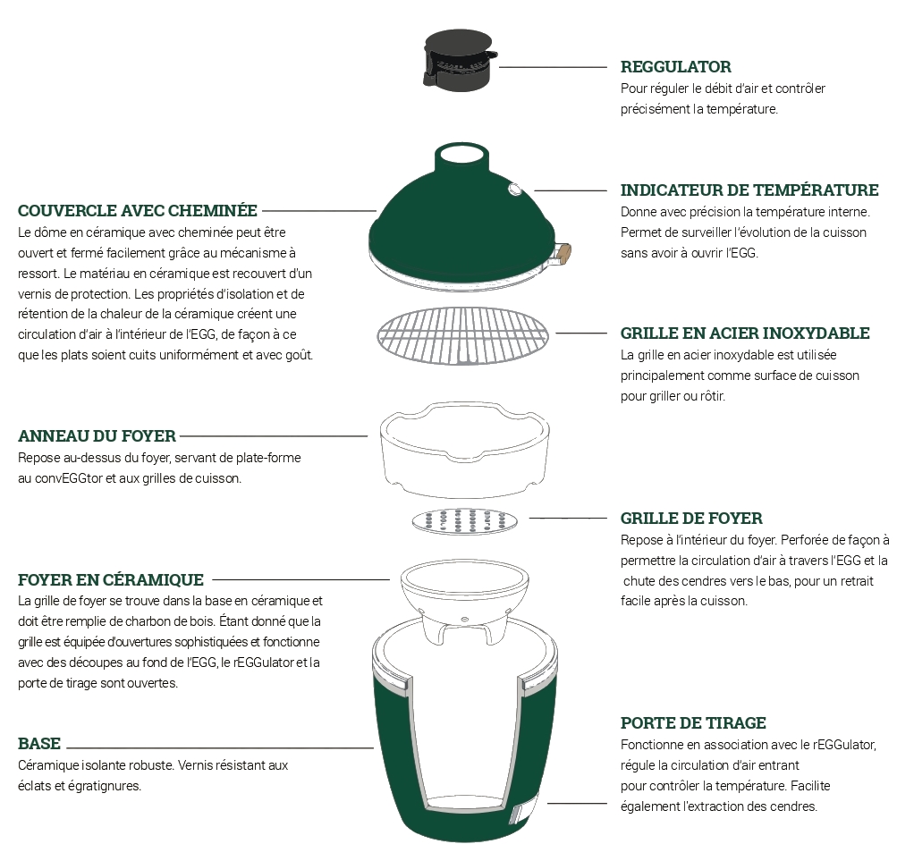 Design original et qualités hors normeVous l'aurez remarquer : le Big Green Egg a un design peu commun. Au premier coup d'oeil, il intrigue et ne laisse pas indifférent. Sous sa forme amusante de gros oeuf vert, se cache un ustensile complet, ingénieux et très résistant. La céramique de très haute qualité de votre Big Green Egg possède des propriétés isolantes exceptionnelles. Hautement résistante aux variations de température et aux températures les plus élevées, Big Green Egg cuit de 50 à 350° C, quelque soit la température extérieure. Plus rien ne vous arrêtera pour cuisiner en extérieur, ni l'hiver, ni les intempéries ! Grâce au charbon de bois naturel Big Green Egg, au calibrage idéal, votre cuiseur est très économe en combustible. En remplissant une seule fois le foyer (1 portion de charbon), vous cuisez pendant 6 à 8 heures de façon constante et vous évitez les manipulations salissantes à répétition ou les approximations de dosage. Le Big Green Egg est composé d'une base et d'un couvercle en céramique isolante d'une grande robustesse. Ils sont garantis à vie ! L'extérieur est verni pour résister aux éclats et aux égratignures. La base est équipée d'un volet de tirage, permettant un contrôle précis de la température et facilitant le retrait des cendres. Une grille empêche les braises de s'échapper. Son couvercle avec cheminée est facile à ouvrir et à fermer, pour une manipulation en toute sécurité. Equipée d'un thermomètre intégré, vous surveillez la température interne de votre barbecue, pour un contrôle de la cuisson optimum. Le haut du couvercle comporte :
