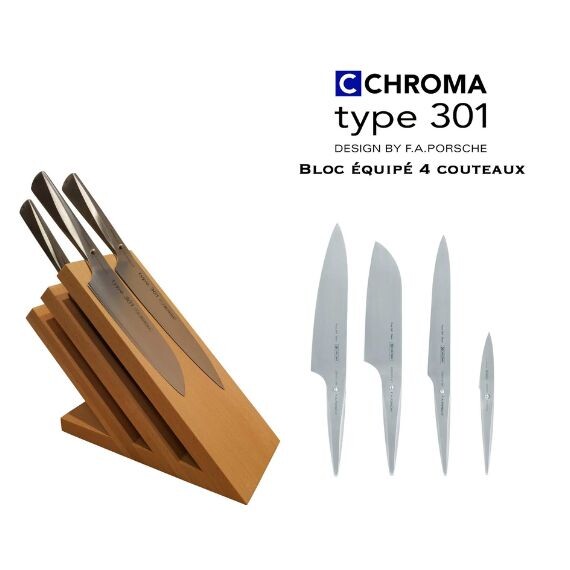 La conception de la collection de couteaux de cuisine Type 301 de Chroma a été confiée au fameux Studio F.A.Porsche. Les designers du studio fondé par le petit fils de Ferdinand Porsche et créateur de la fameuse Porsche 911, ont imaginé des couteaux à la forme innovante et exclusive.