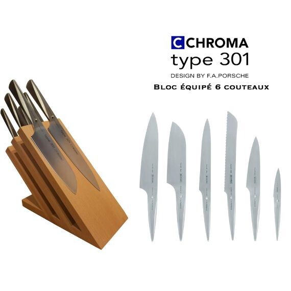 La conception de la collection de couteaux de cuisine Type 301 de Chroma a été confiée au fameux Studio F.A.Porsche. Les designers du studio fondé par le petit fils de Ferdinand Porsche et créateur de la fameuse Porsche 911, ont imaginé des couteaux à la forme innovante et exclusive.