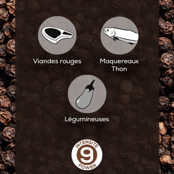 Ce poivre intense s'associe parfaitement aux viandes rouges, aux poissons gras, ainsi qu'aux légumes tels que les choux rouges, les tomates et les pommes de terre. Il sublime également les plats à base de légumineuses. Offrez une explosion de saveurs à chaque bouchée grâce à l'intensité exceptionnelle notée 9 sur l'échelle Peugeot.