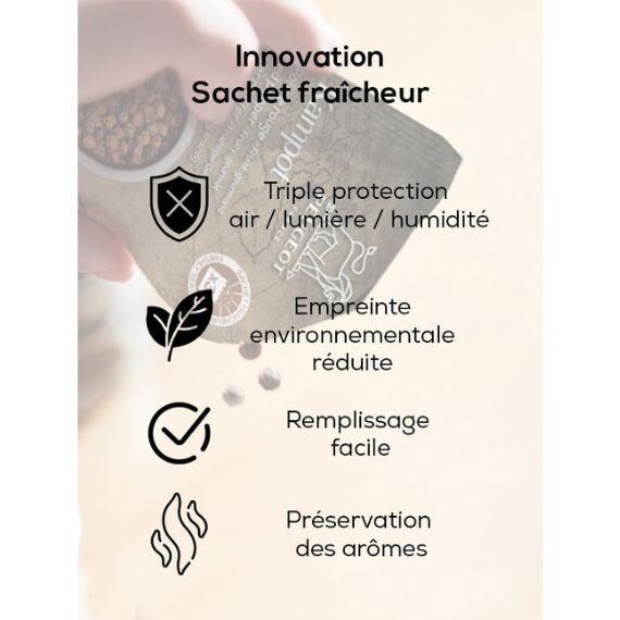 La boîte de 7 sachets Tan Hoi Peugeot est pensée pour préserver la fraîcheur et l'intensité du poivre. Chaque sachet hermétique assure une triple protection contre l'air, la lumière et l'humidité, garantissant ainsi une conservation optimale. Facile à remplir, cette solution offre une empreinte environnementale réduite, soulignant l'engagement de Peugeot envers la préservation de l'environnement.