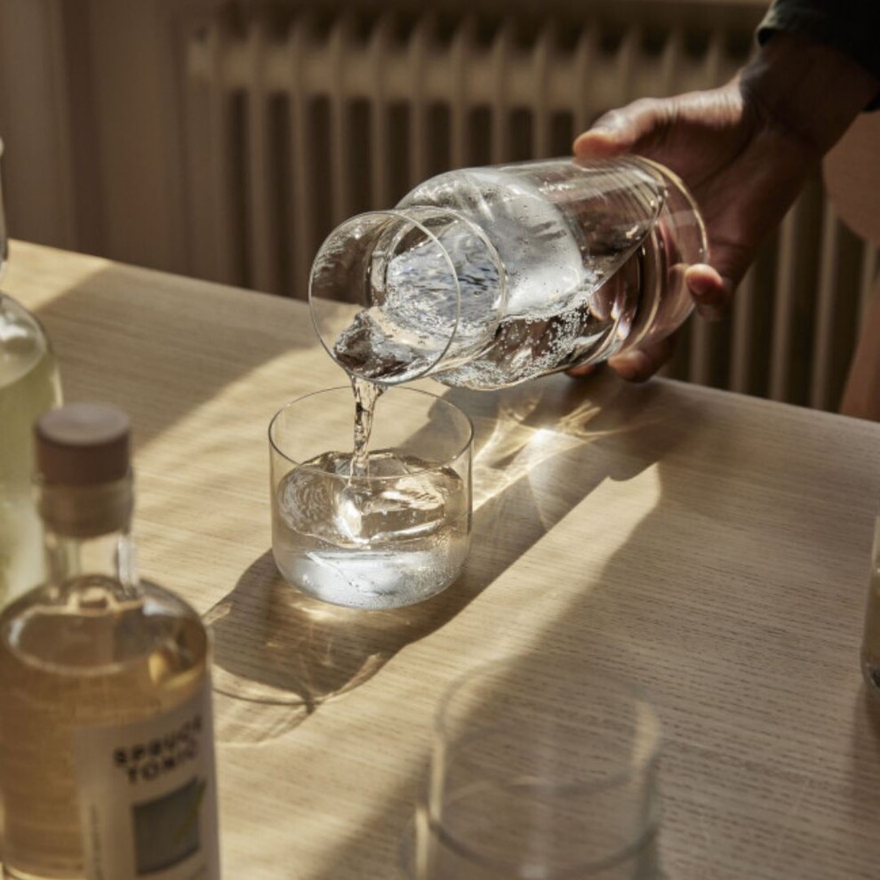 Astuce : associez la Carafe et sa cuillère à l’ensemble de verres Nesting de Aarke. Les verres reprennent la même silhouette que le haut de la carafe, et le verre le plus large peut servir de couvercle pratique et esthétique !