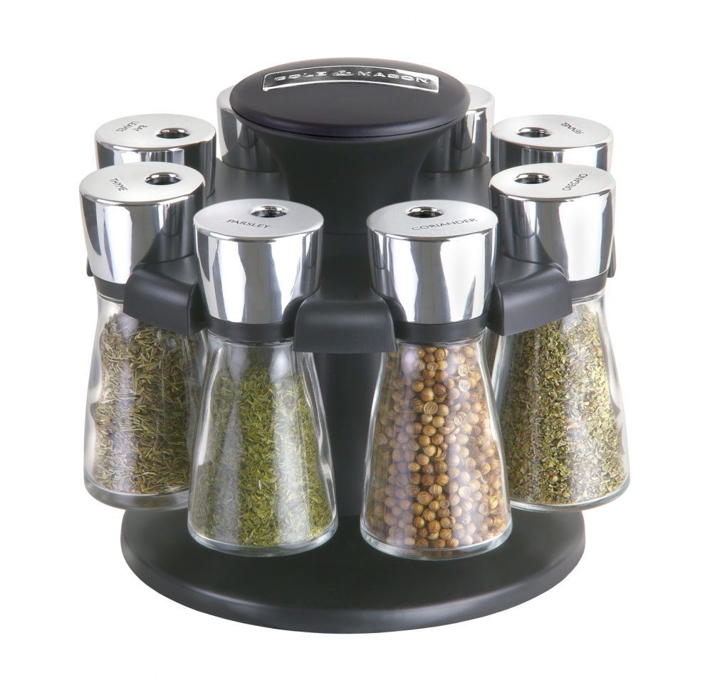 Le présentoir bois 8 flacons avec épice de Colle & Mason vous permet d'avoir accès à 8 pots à épices avec un contenu facilement identifiable marqué sur le bouchon. Les bocaux de verre sont attrayants avec leurs bouchons brillants et contemporains chromés aux 3 réglages : verser, saupoudrer et fermer. Le support est en bois de noyer teinté et est équipé de pieds en caoutchouc antidérapants. Inclut : basilic, graines de coriandre, graines de fenouil, marjolaine, origan, persil, piments concassés et thym.