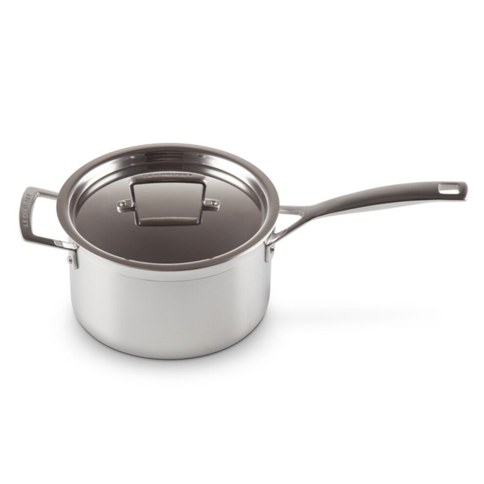 La casserole en inox de la marque Le Creuset est revêtue de 3 couches d'inox et d'aluminium, ce qui permet une optimisation de l’homogénéité de la chaleur pour une cuisson parfaite.