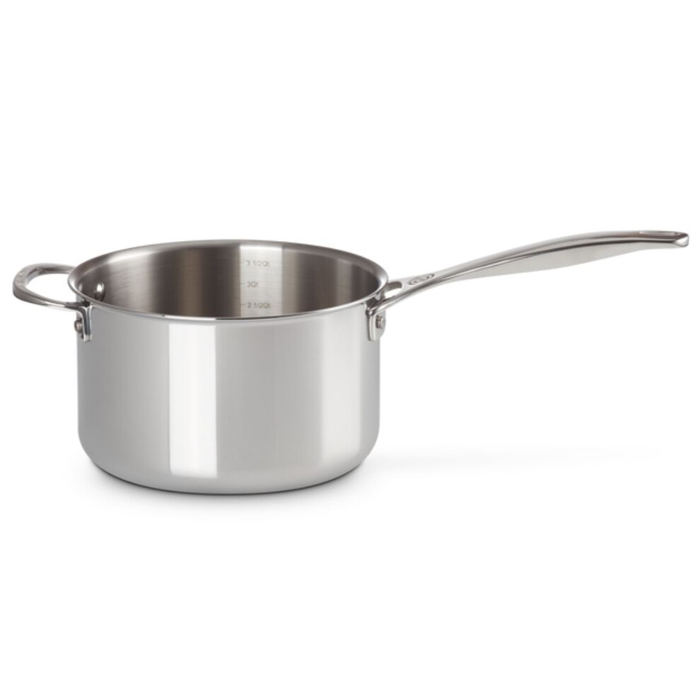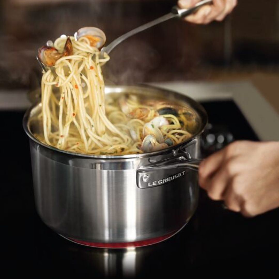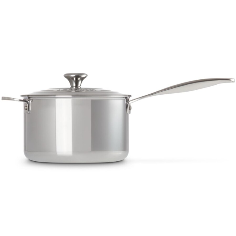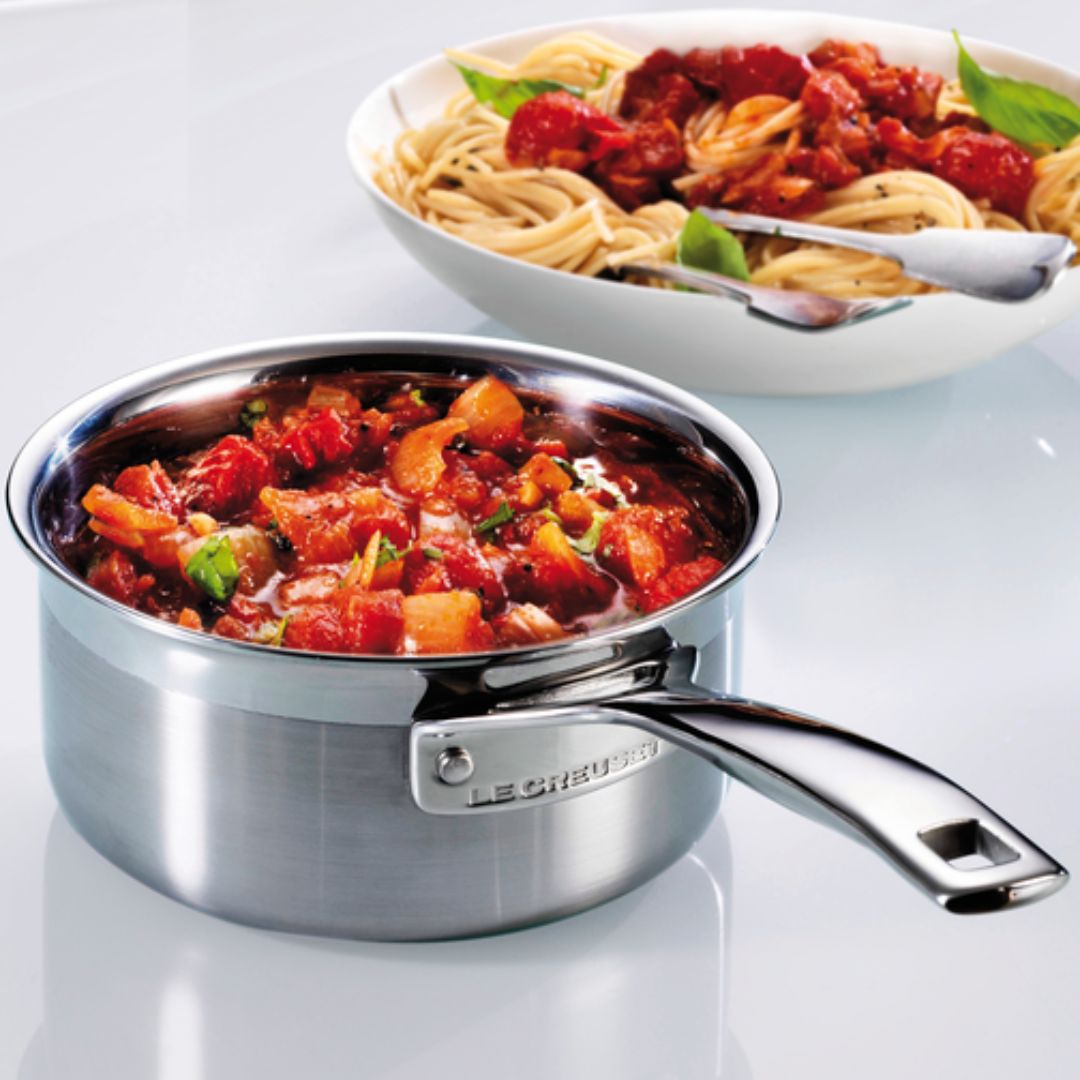 La casserole en inox de la marque Le Creuset est revêtue de 3 couches d'inox et d'aluminium, ce qui permet une optimisation de l’homogénéité de la chaleur pour une cuisson parfaite.