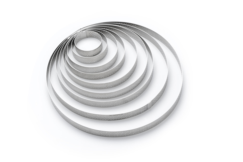 Cercle à tarte perforé rond en acier inoxydable idéal pour les tartes, tartelettes, tourtes et quiches, développé en partenariat avec l’Ecole du Grand Chocolat Valrhona.
