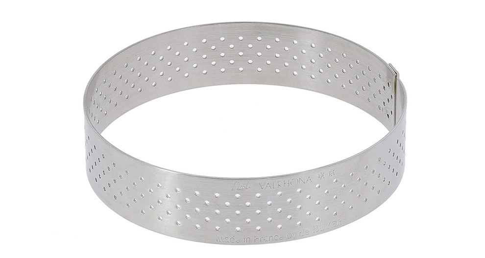 Cercle à tarte perforé rond en acier inoxydable idéal pour les tartes, tartelettes, tourtes et quiches, développé en partenariat avec l’Ecole du Grand Chocolat Valrhona.