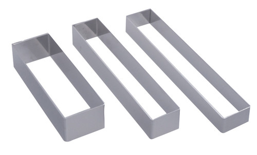 Formes rectangles aux angles vifs, avec des bords droits, idéals pour dresser des garnitures sur assiette, réaliser des portions infividuelles de lasagnes, présenter élégamment des tartares de saumon ou de bœuf, monter des entremets originaux...