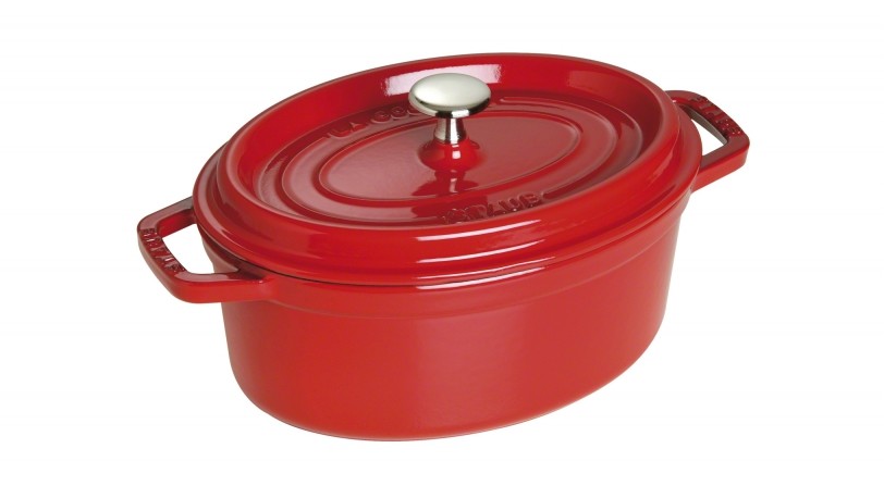 Cocotte en fonte Staub ovale cerise 31 cm avec couvercle à bouton laiton