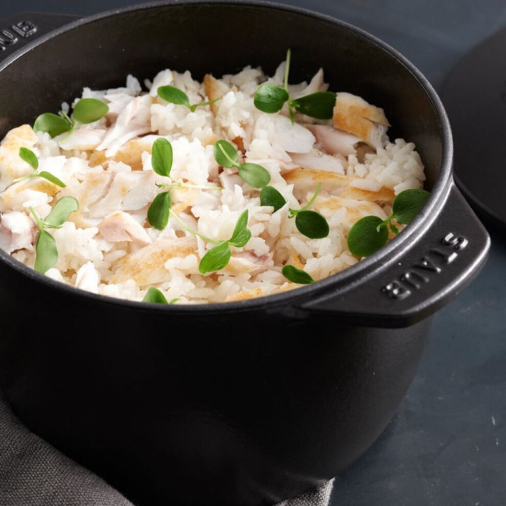 Résultat : un riz aérien et parfumé, des céréales fondantes, des flocons d'avoine crémeux ou encore des légumineuses tendres. L’arrosage continu évite que les aliments n’adhèrent au fond ou aux parois. Polyvalente, la cocotte Gohan permet de réaliser une large gamme de plats sucrés ou salés à base de riz, céréales ou légumineuses. Son émail noir mat intensifie les arômes, tandis que la fonte garantit une diffusion optimale de la chaleur, rendant la cuisson des légumineuses plus rapide et économe en eau par rapport à une casserole classique.