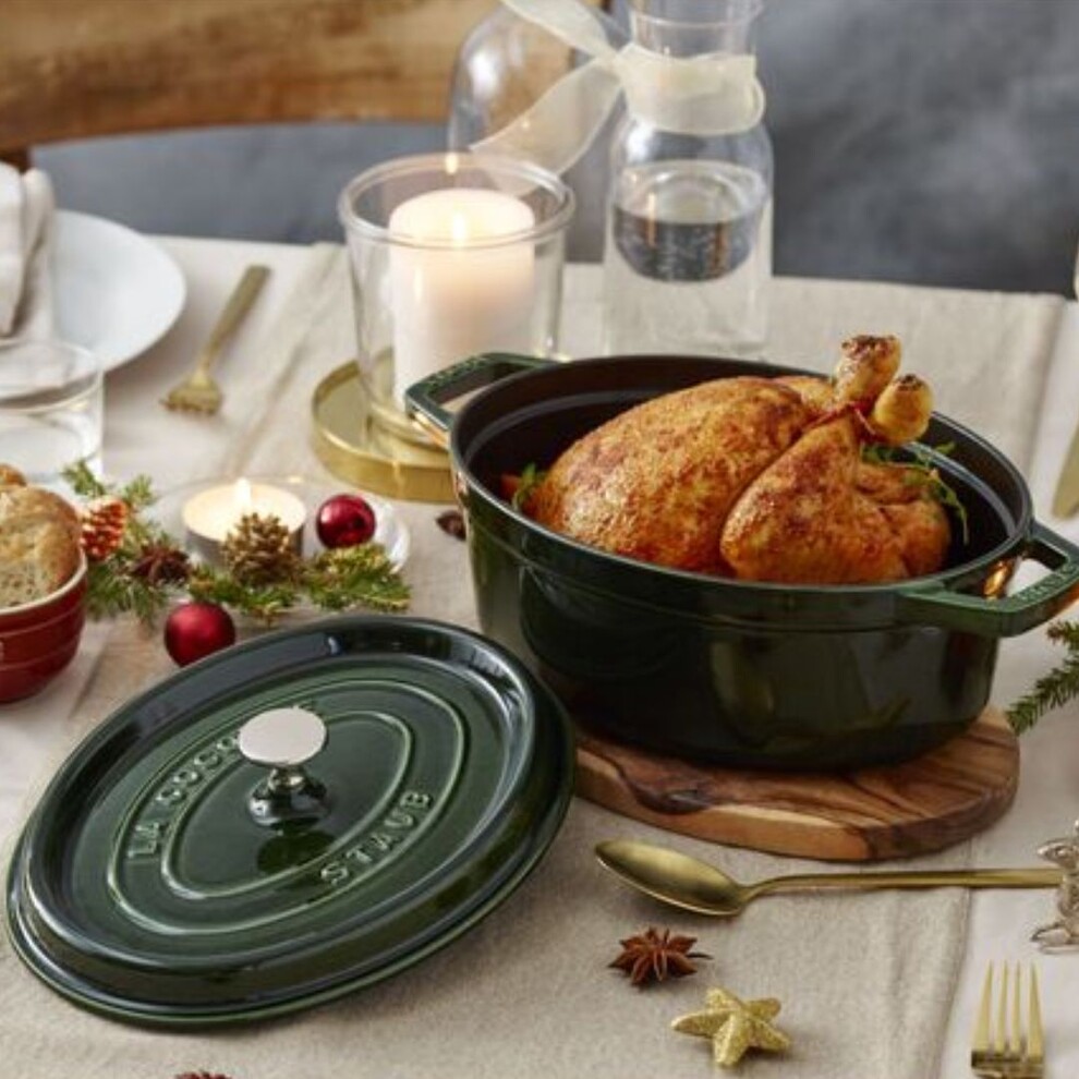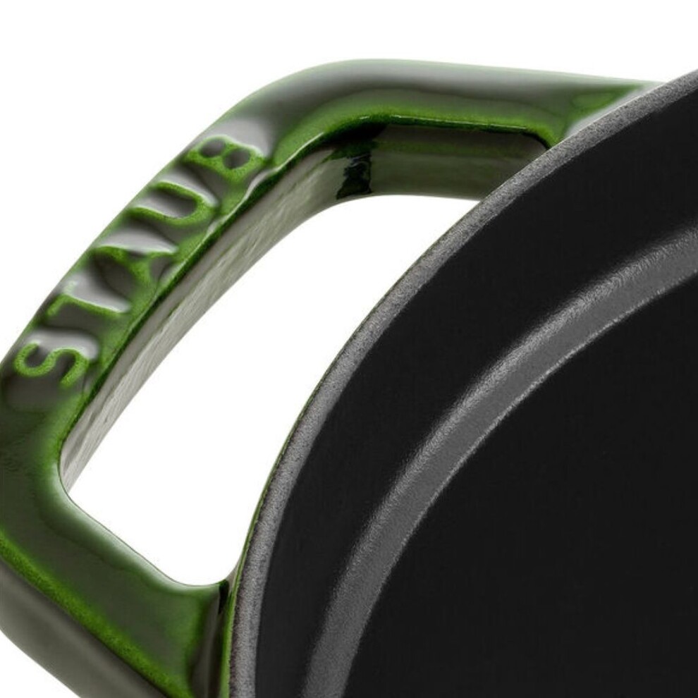Cette cocotte STAUB en fonte émaillée verte Basilic de 31 cm est adaptée pour 5 à 6 personnes, idéale pour préparer des plats mijotés, des rôtis, de la volaille et même du pain.