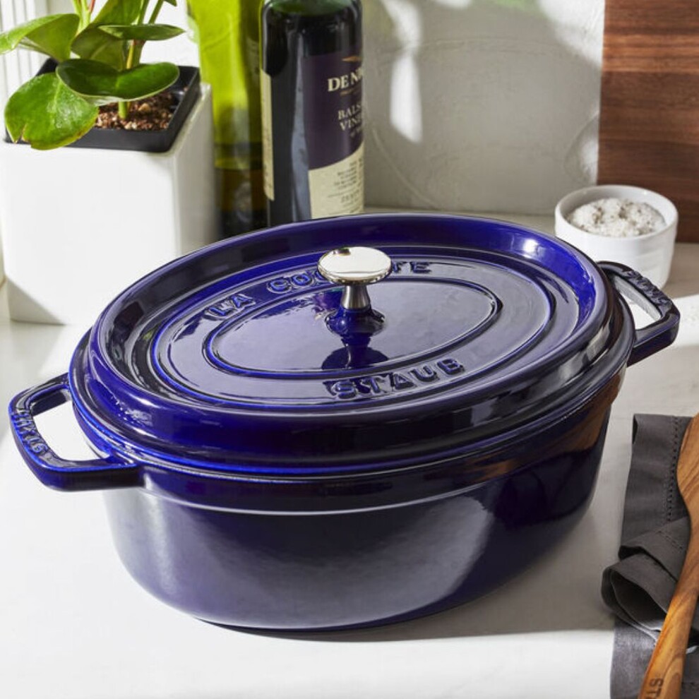 Cette cocotte STAUB en fonte émaillée verte Basilic de 31 cm est adaptée pour 5 à 6 personnes, idéale pour préparer des plats mijotés, des rôtis, de la volaille et même du pain.