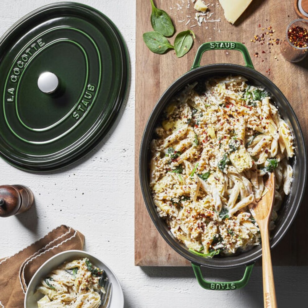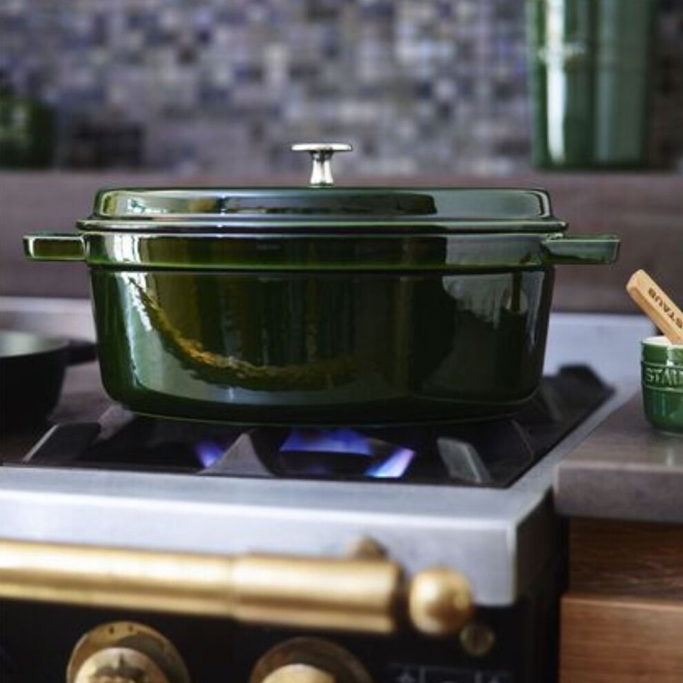Cette cocotte STAUB en fonte émaillée verte Basilic de 33 cm est adaptée pour 7 personnes, idéale pour préparer des plats mijotés, des rôtis, de la volaille et même du pain.