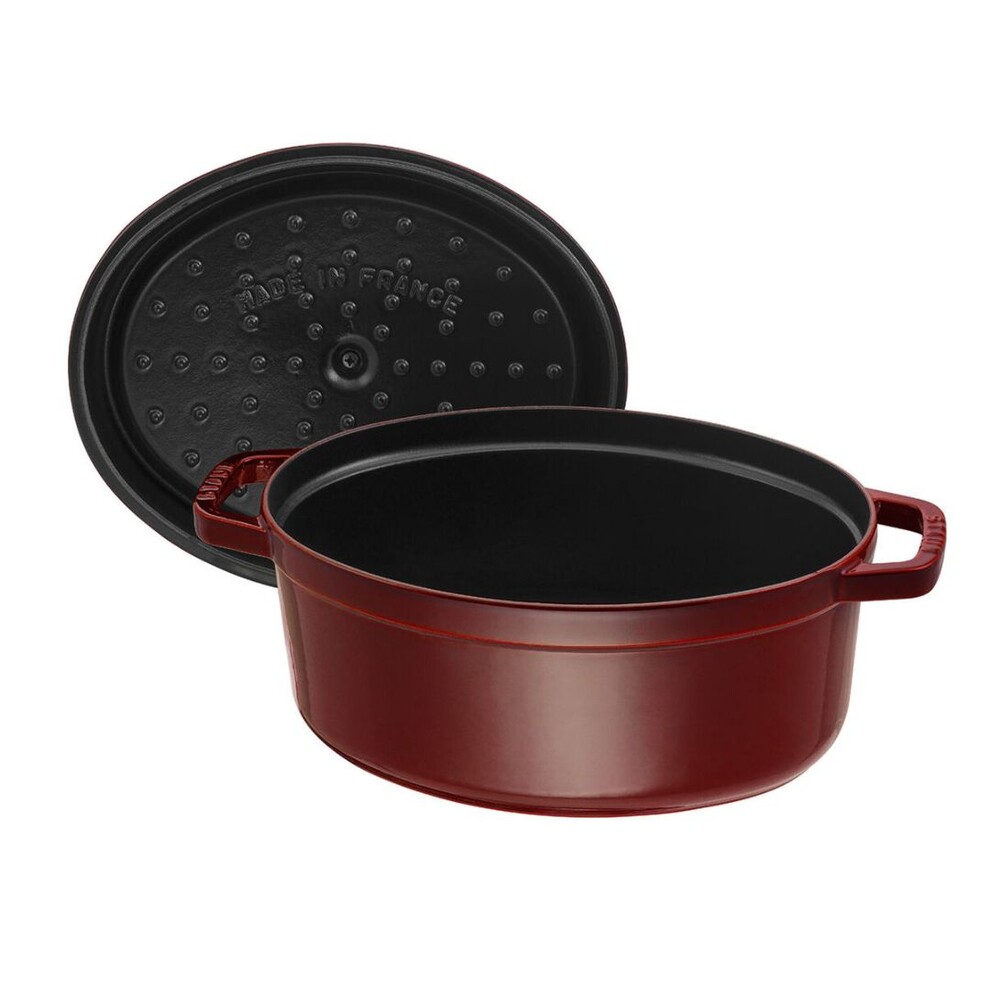 Cette cocotte STAUB en fonte émaillée rouge grenadine de 33 cm est adaptée pour 6-7 personnes, idéale pour préparer des plats mijotés, des rôtis, de la volaille et même du pain.