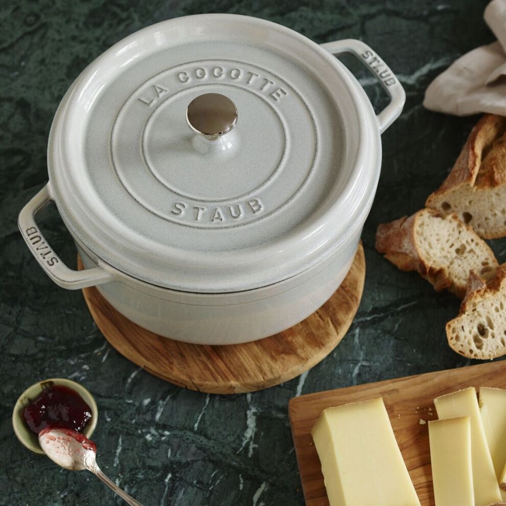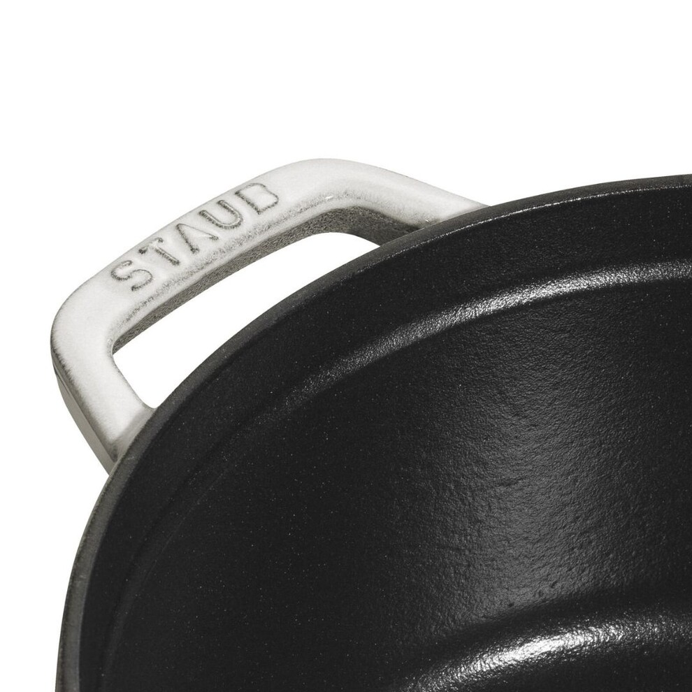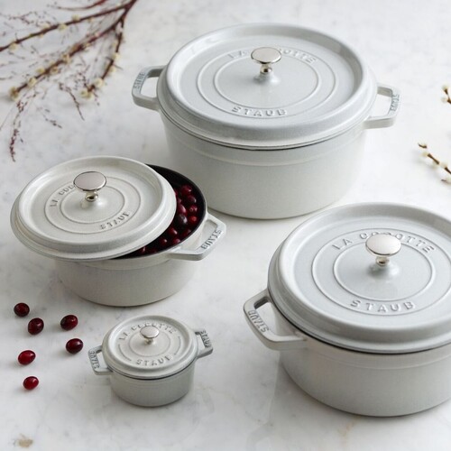 Cette cocotte STAUB en fonte blanche de 22 cm est adaptée pour 2-3 personnes, idéale pour préparer des plats mijotés, des rôtis, de la volaille et même du pain.