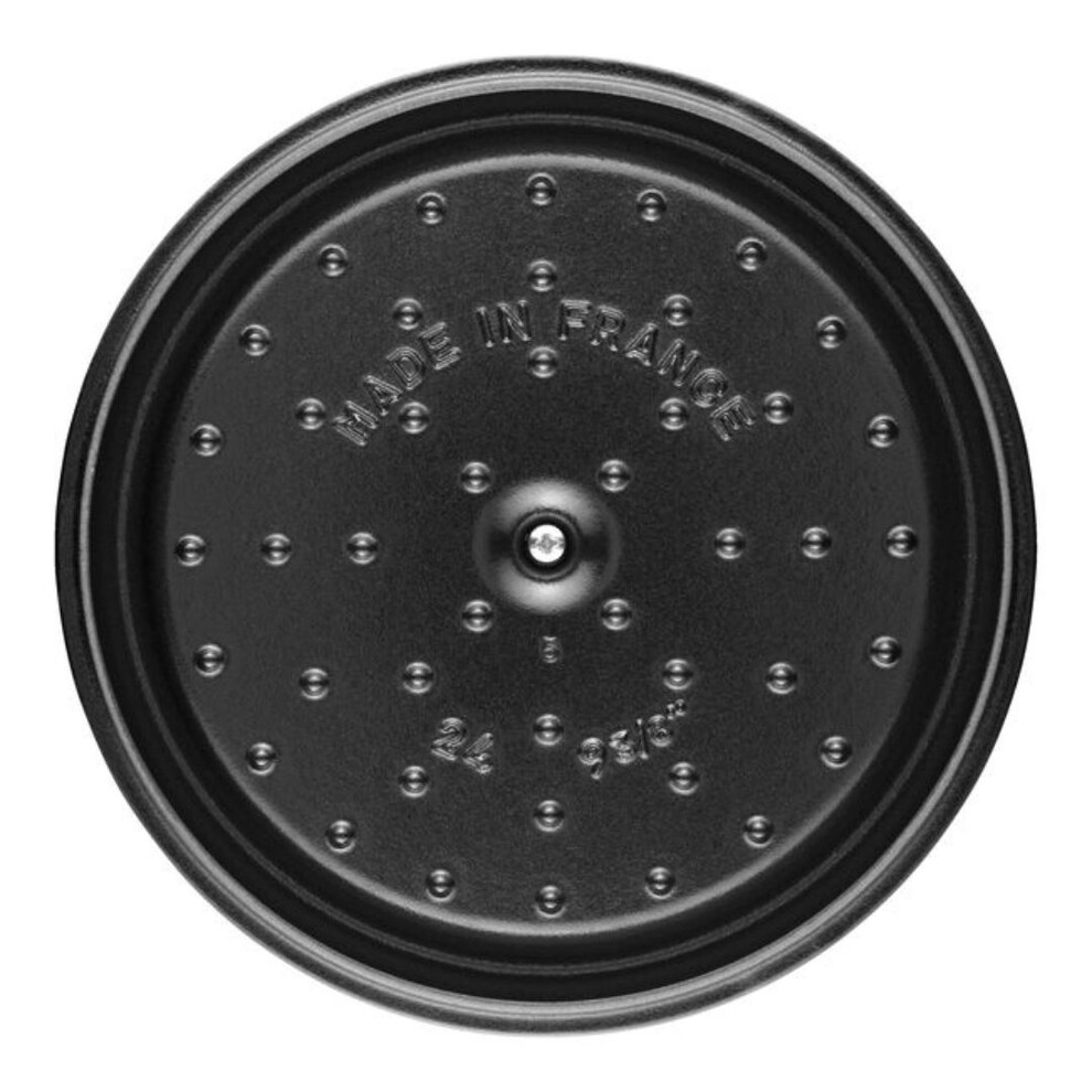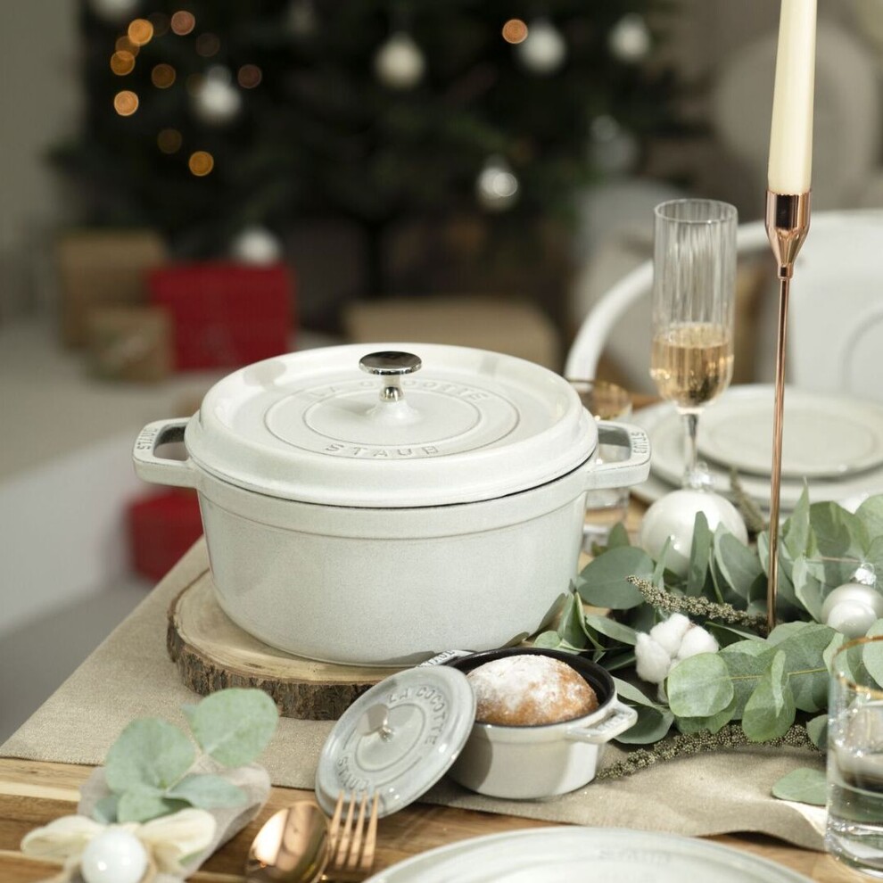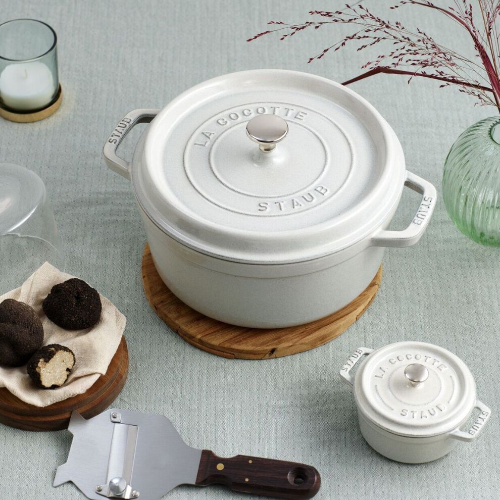 Cette cocotte STAUB en fonte blanche de 24 cm est adaptée pour 3-4 personnes, idéale pour préparer des plats mijotés, des rôtis, de la volaille et même du pain.