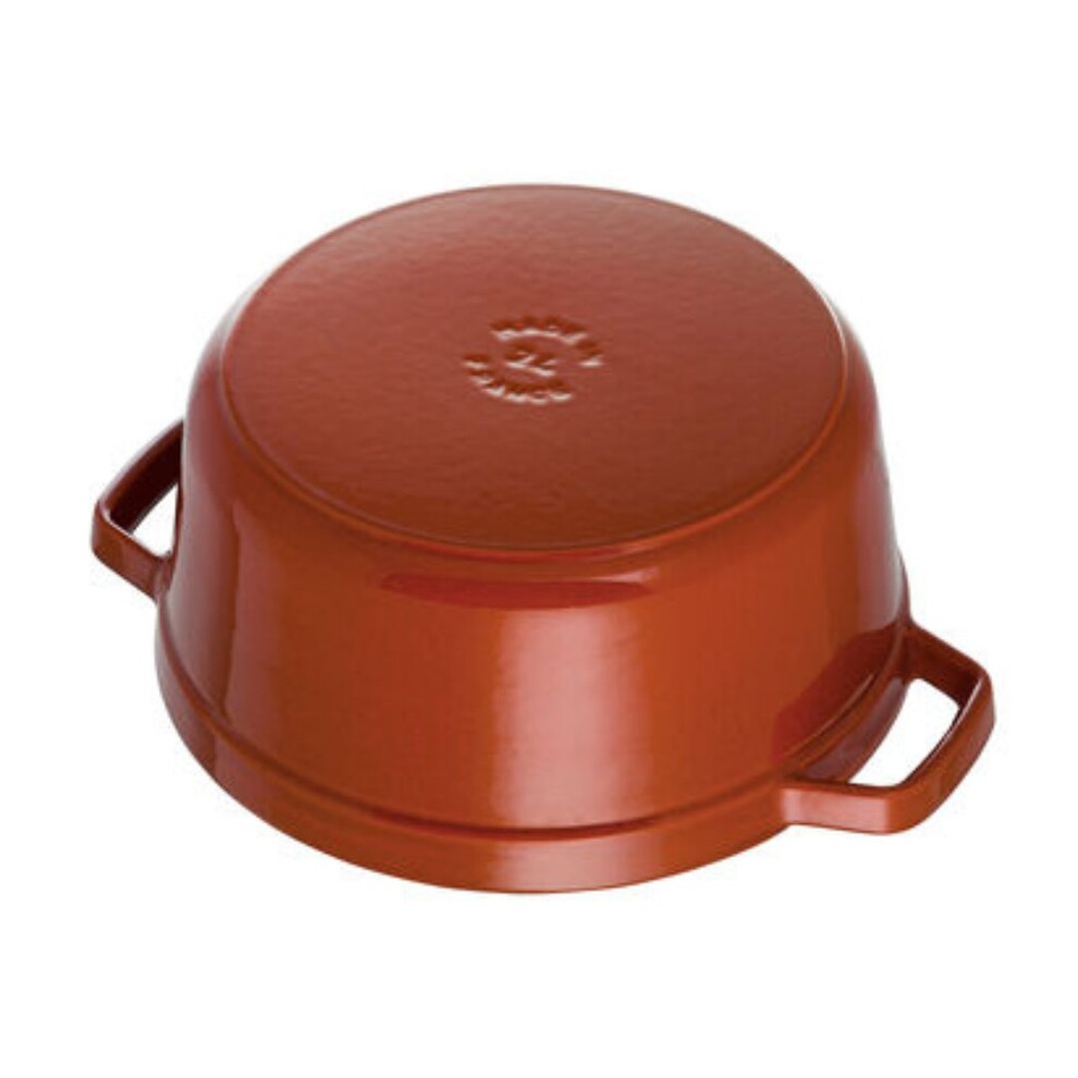 Cette cocotte STAUB orange cannelle en fonte de 26 cm est adaptée pour 4 à 5 personnes, idéale pour préparer des plats mijotés, des rôtis, de la volaille et même du pain.