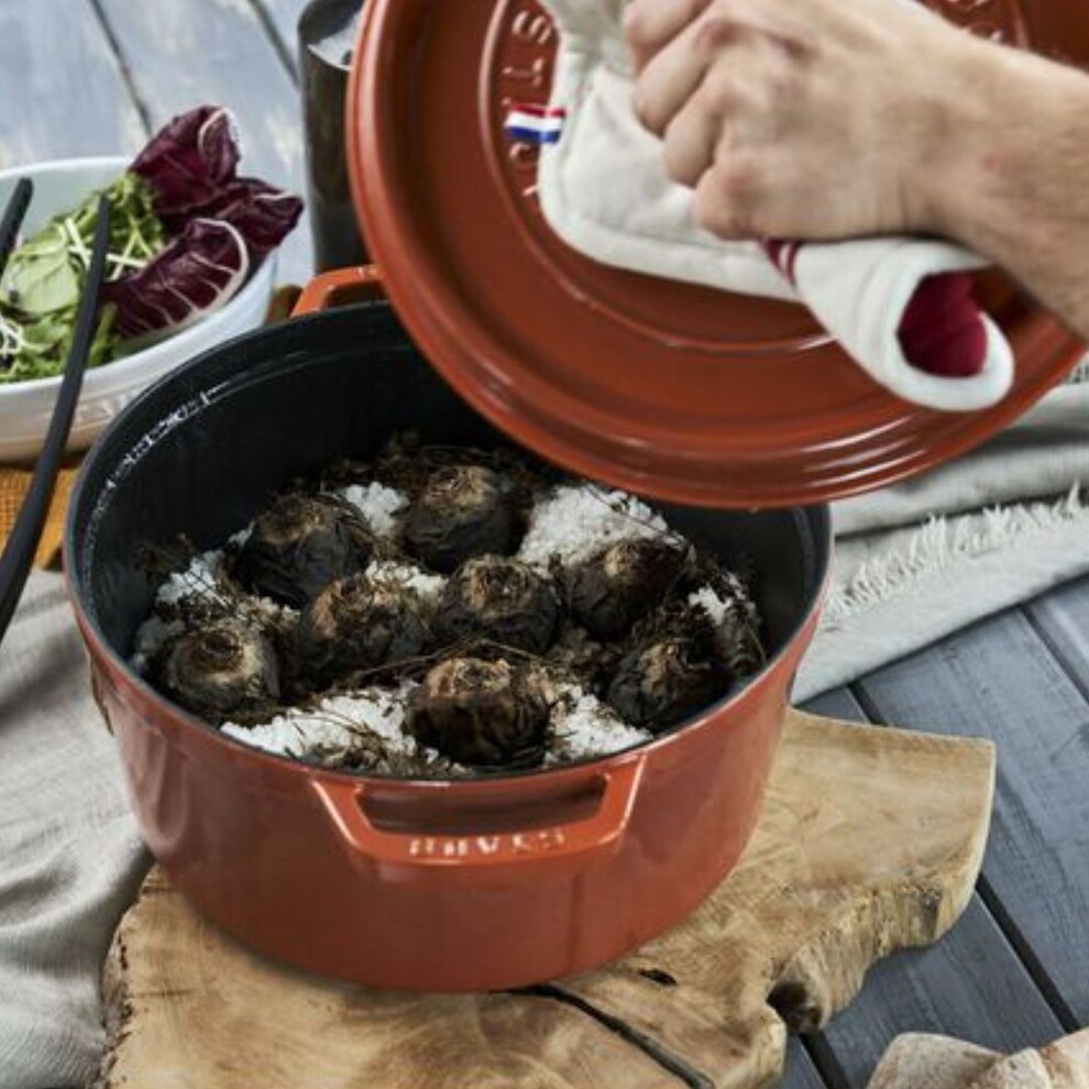 L’émaillage noir mat de l’intérieur de la cocotte fait office de structure de type micro-grill afin d’offrir de succulents arômes légèrement rôtis, ainsi que des mets tendres et juteux. De plus, cette surface intérieure est extrêmement résistance aux rayures et est facilement nettoyable après usage.