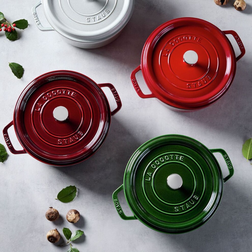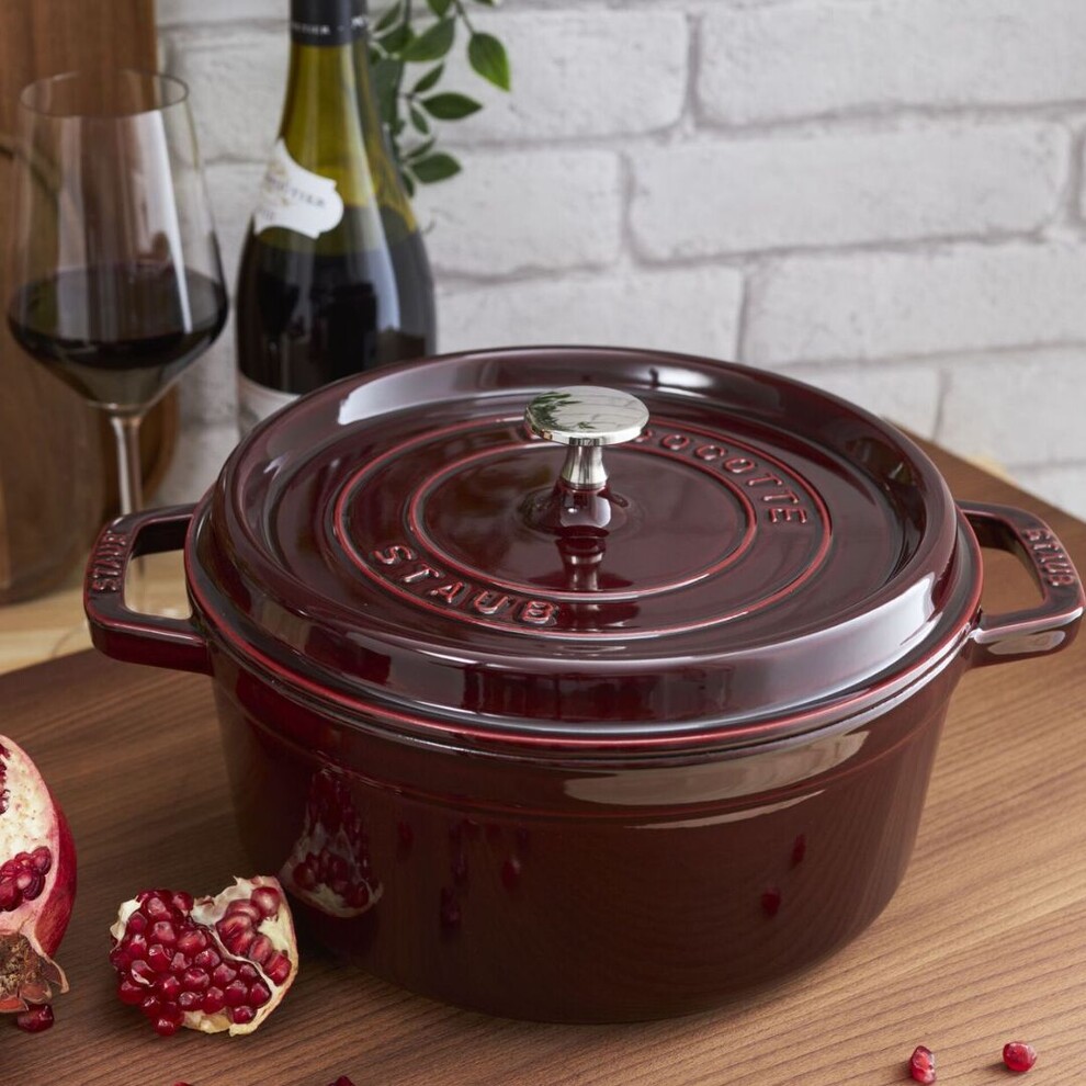 Cette cocotte STAUB rouge grenadine en fonte de 26 cm est adaptée pour 4 ou 5 personnes, idéale pour préparer des plats mijotés, des rôtis, de la volaille et même du pain.