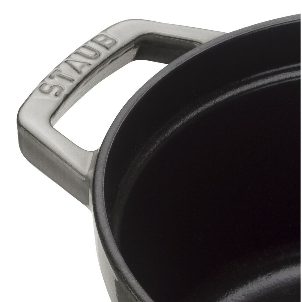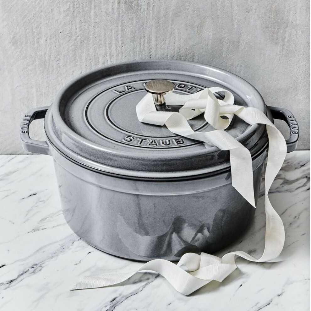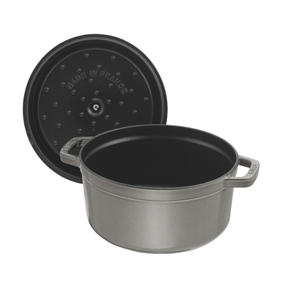 Cette cocotte STAUB en fonte émaillée de 26 cm est adaptée pour 4 à 5 personnes, idéale pour préparer des plats mijotés, des rôtis, de la volaille et même du pain.