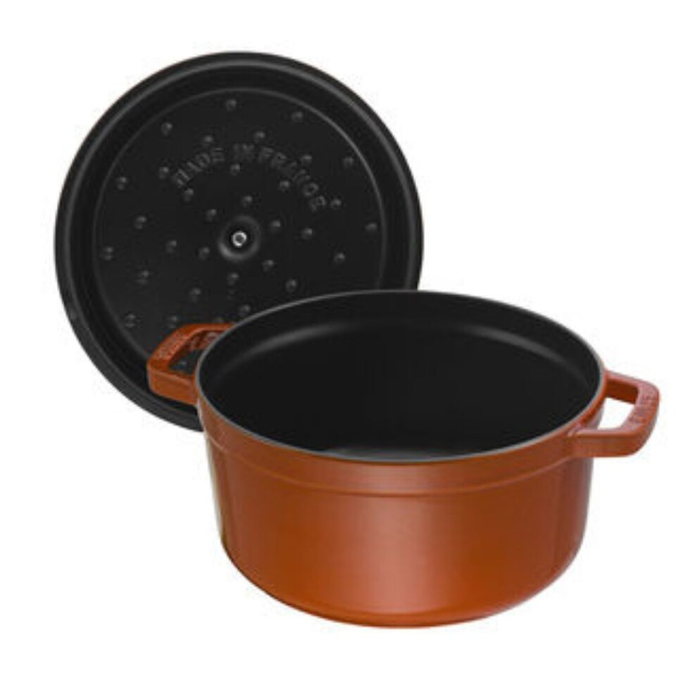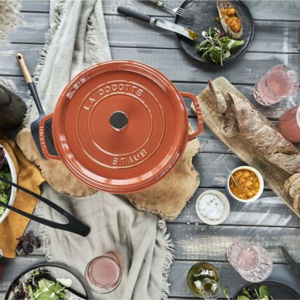 Cette cocotte STAUB orange cannelle en fonte de 28 cm est adaptée pour 6 à 7 personnes, idéale pour préparer des plats mijotés, des rôtis, de la volaille et même du pain.