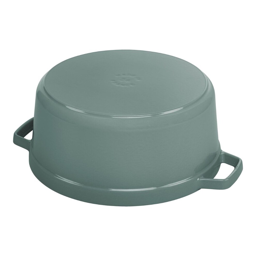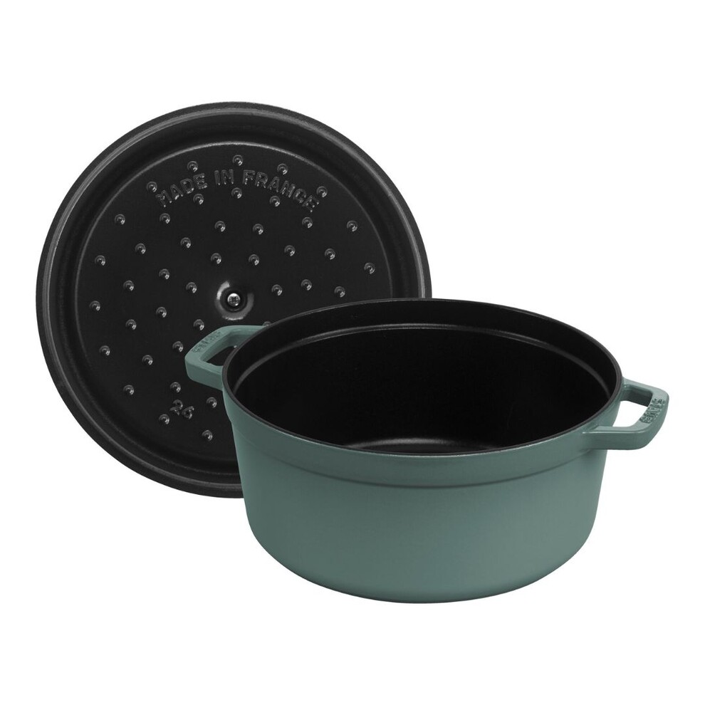 Cette cocotte STAUB en fonte émaillée de 28 cm est adaptée pour 6 ou 7 personnes, idéale pour préparer des plats mijotés, des rôtis, de la volaille et même du pain.
