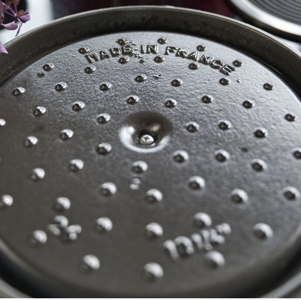 Son couvercle plat au contour marqué assure, grâce à ses picots®, le respect des saveurs selon un processus bien particulier, que l’on appelle la « pluie d’arômes », qui permet une répartition homogène de l’humidité dont bénéficient directement les saveurs et la consistance du mets.