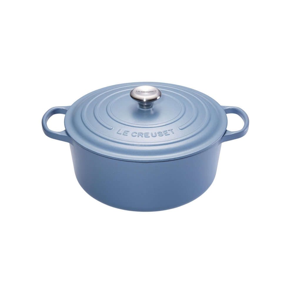 Avec la cocotte en fonte ronde 24 cm bleu Minéral, votre table sera égayée d'une douce touche bleutée.