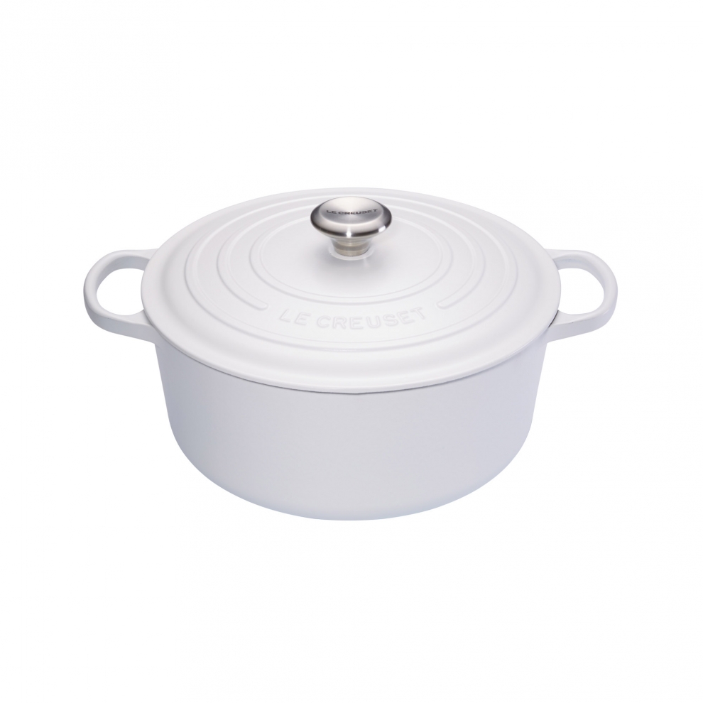 La cocotte en fonte Le Creuset ronde 26 cm coloris blanc Coton (finition mate) possède une capacité de 5,3 litres.