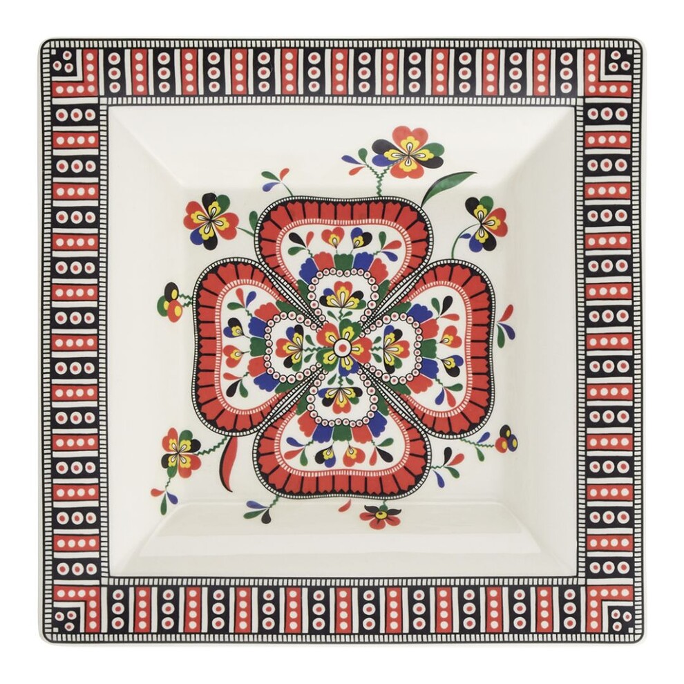 Son amour pour les arts décoratifs et l’artisanat français l’a naturellement menée à collaborer avec Gien. Pour la collection « Chance Folle », Nathalie Farman-Farma a imaginé un foulard folklorique inspiré du trèfle à quatre feuilles, qu’elle a ensuite déconstruit et réassemblé en une série de ribambelles. Ces éléments se mêlent et se réinventent sur la table, offrant une nouvelle lecture du motif.