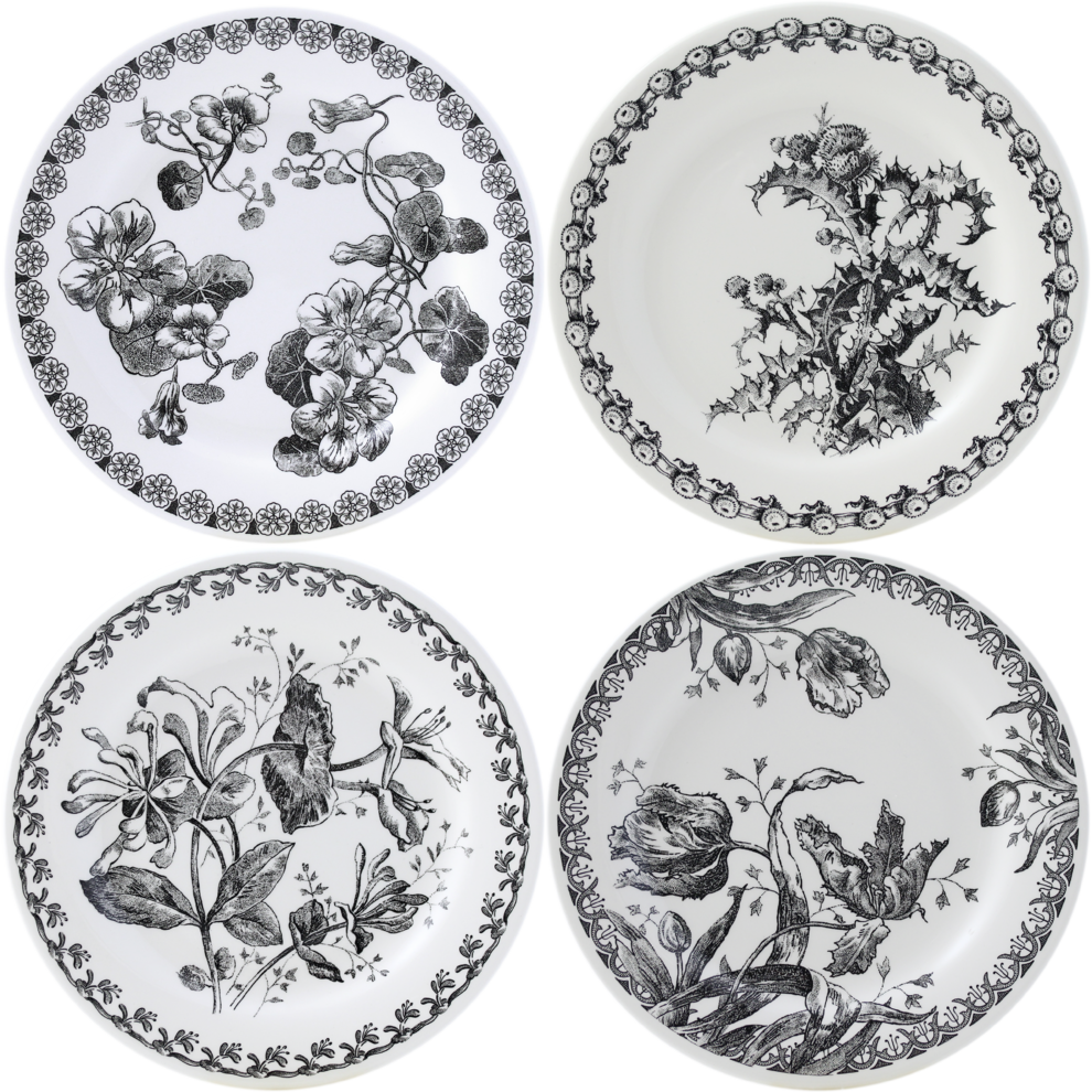 Avec ces rééditions de décors de la fin du XIX ème siècle, issus du patrimoine Gien, rédécouvrez la sobriété des fleurs noires: Tulipes, Chèvrefeuille, Capucine et Chardon.