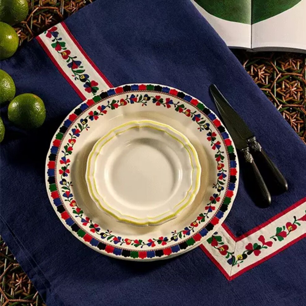 Son amour pour les arts décoratifs et l’artisanat français l’a naturellement menée à collaborer avec Gien. Pour la collection « Chance Folle », Nathalie Farman-Farma a imaginé un foulard folklorique inspiré du trèfle à quatre feuilles, qu’elle a ensuite déconstruit et réassemblé en une série de ribambelles. Ces éléments se mêlent et se réinventent sur la table, offrant une nouvelle lecture du motif.