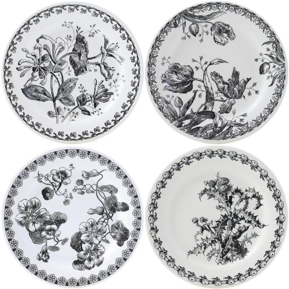 Avec ces rééditions de décors de la fin du XIX ème siècle, issus du patrimoine Gien, rédécouvrez la sobriété des fleurs noires: Tulipes, Chèvrefeuille, Capucine et Chardon.