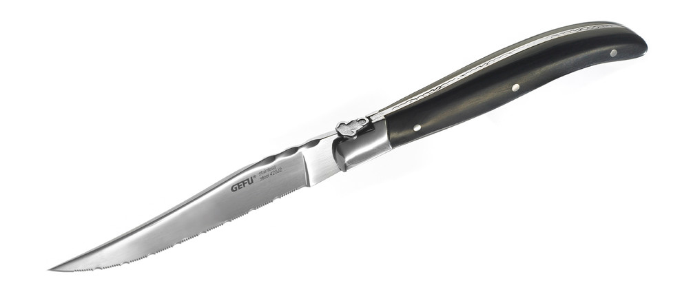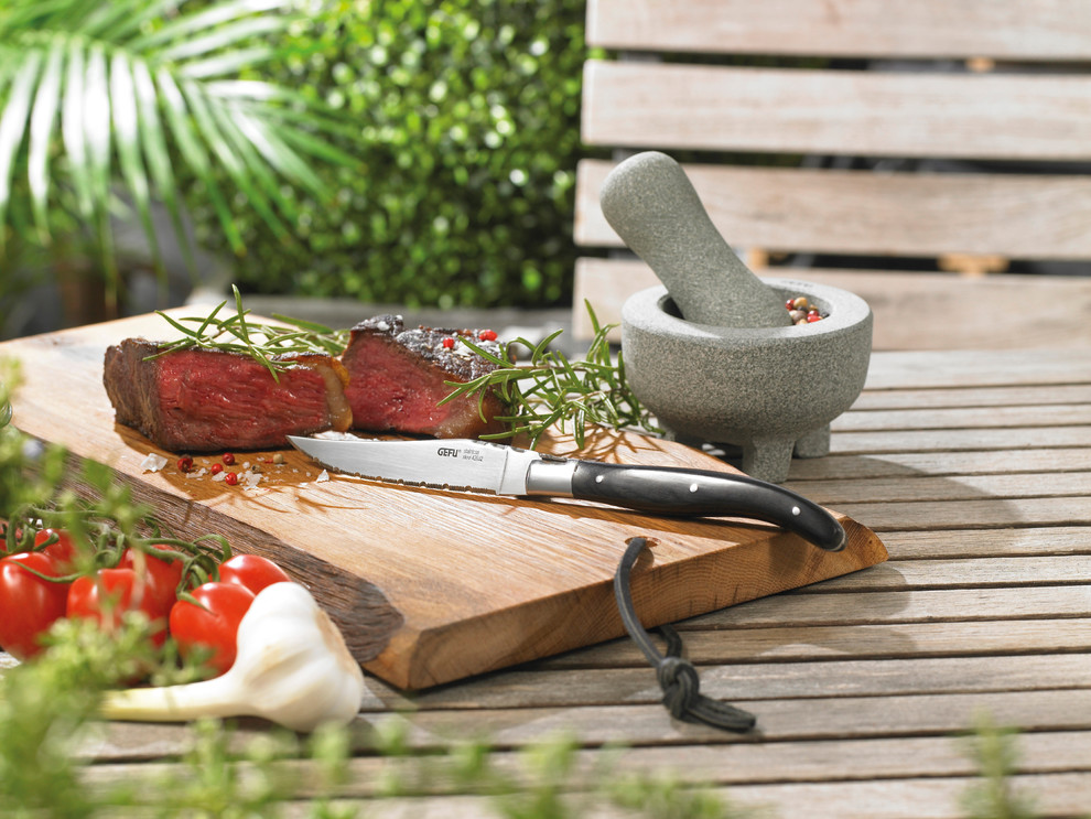 Un très joli set de 4 couteaux à steak BASCO pour découper parfaitement vos steak. La lame à dents fines tranche efficacement la viande et le manche en bois avec rivets inox est facile à manipuler.