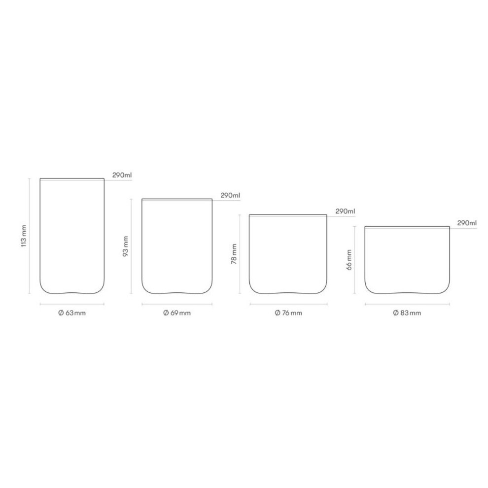 Chaque verre, bien que de forme différente, a une capacité identique de 290 ml. Idéal pour l’eau, les cocktails avec ou sans alcool, ou en coffret cadeau.