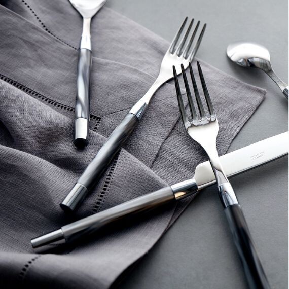 Avec leur manche en résine acrylique, le haut de couvert découpé en inox 18/10 et leur virolle en laiton décolletée, chromée, les couverts Conty vous apporteront une subtile élégance à votre table !