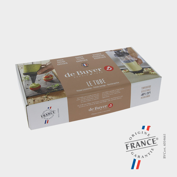 Retrouvez le piston à pâtisserie 75 cl Le Tube DE BUYER qui remplit les même fonctions qu’une poche pâtissière : remplir, garnir, décorer mais cela beaucoup plus facilement ! Il est idéal pour doser les pâtes, les crèmes et mousses et il vous permet d’effectuer un travail facile, rapide, précis et soigné. Grace à la molette vous réglez la quantité à verser et pressez le manche ce qui vous délivrera une dose de préparation. Impressionnez vos invités avec des préparations parfaites sucrées ou salées, chaudes ou froides. Son système de douilles démontables et interchangeables vous permettra d’utiliser les douilles en tritan cannelées, lisses ou autres modèles livrées dans le coffret afin de réaliser diverses décorations.