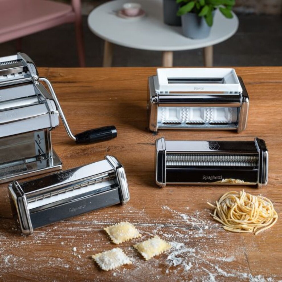 Ce kit Multipast avec machine à pâtes manuelle Atlas 150 Classic et 6 accessoires contient tout l'indispensable pour organiser une pasta-party d'exception. Vos fettucine, taglioni ou reginette seront simplement irrésistibles.