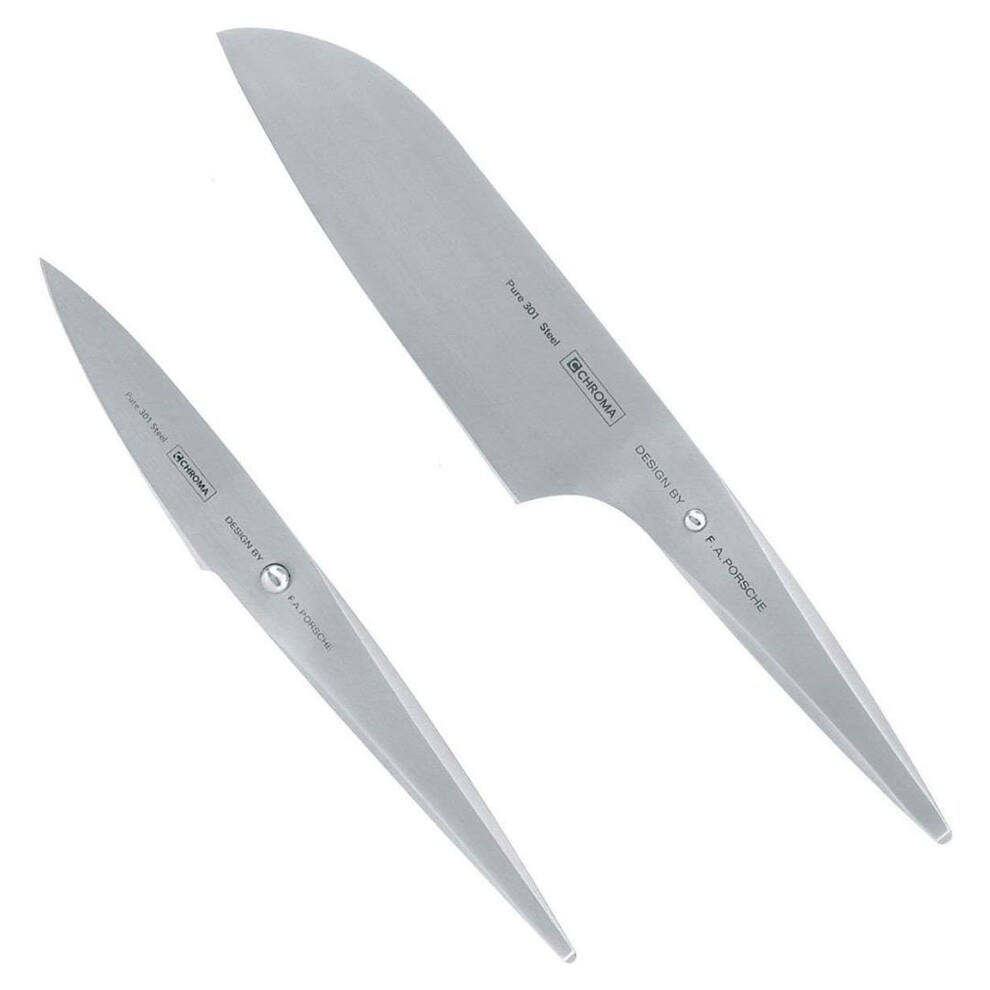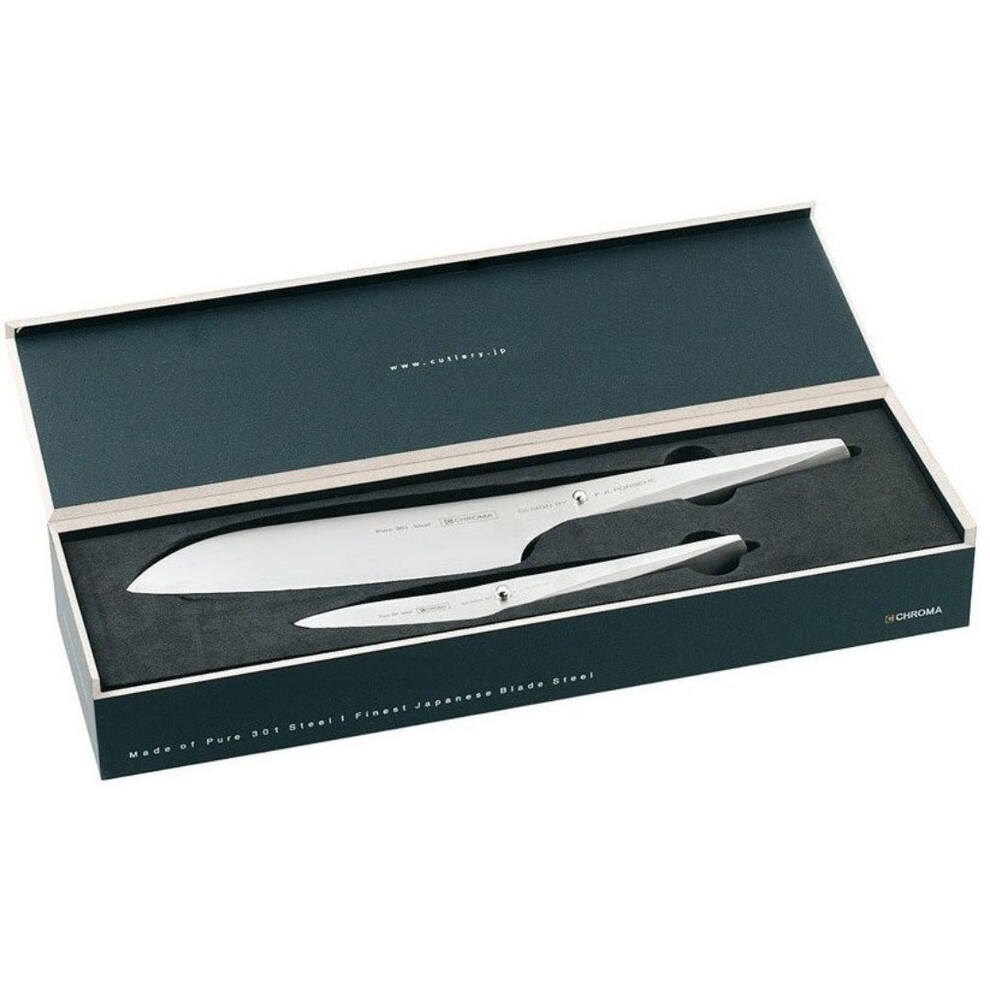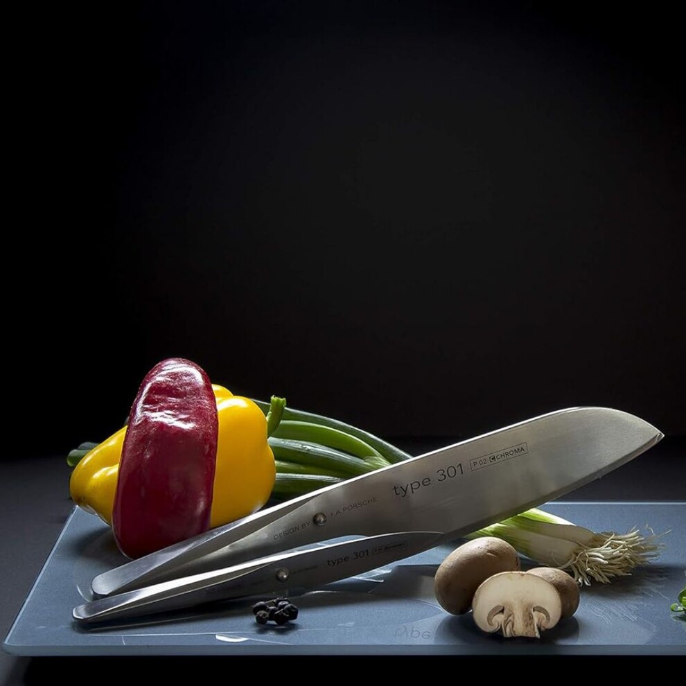 La conception de la collection de couteaux de cuisine Type 301 de Chroma a été confiée au fameux Studio F.A.Porsche. Les designers du studio fondé par le petit fils de Ferdinand Porsche et créateur de la fameuse Porsche 911, ont imaginé des couteaux à la forme innovante et exclusive.
