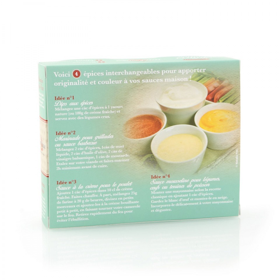 Un coffret de préparation contenant 4 épices interchangeables pour apporter originalité et couleur à vos sauces maison !