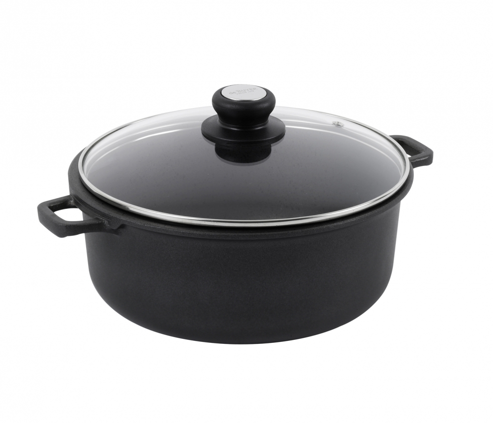 Coquelle avec couvercle en verre, parfaite pour faire mijoter. Bord haut favorisant la condensation, idéal pour les cuissons douces et longues.