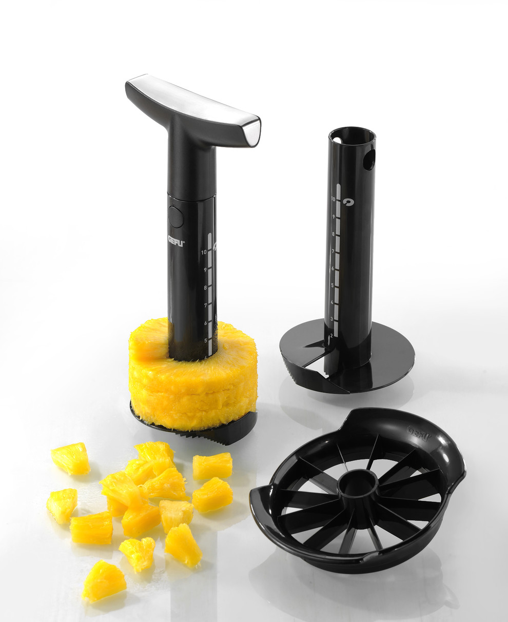 Ce coupe ananas "COMFORT" se compose de trois parties en plastique antichoc, avec deux embouts de coupe (un médium adapté pour les ananas de 1.25 - 2.5 kg et un large adaptée pour les ananas de plus de 2.5 kg).