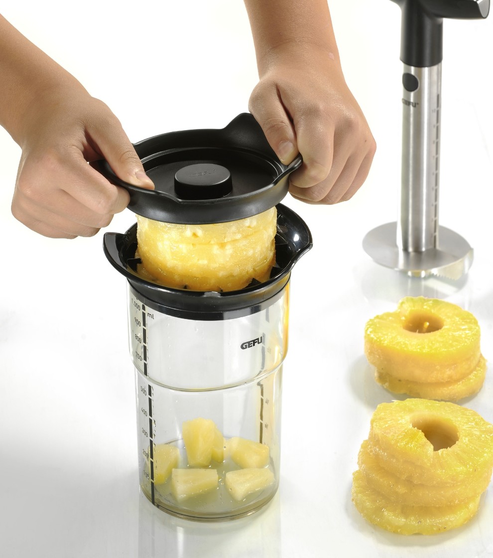 Ce modèle est équipé d'un récipient 1000ml avec couvercle fraîcheur et graduation pour conserver 1 à 2 ananas et qui passe dans les portes de frigo. La coupe se fait directement dans le récipient et le coupe ananas 12 segments peut se ranger dans son couvercle, pratique !