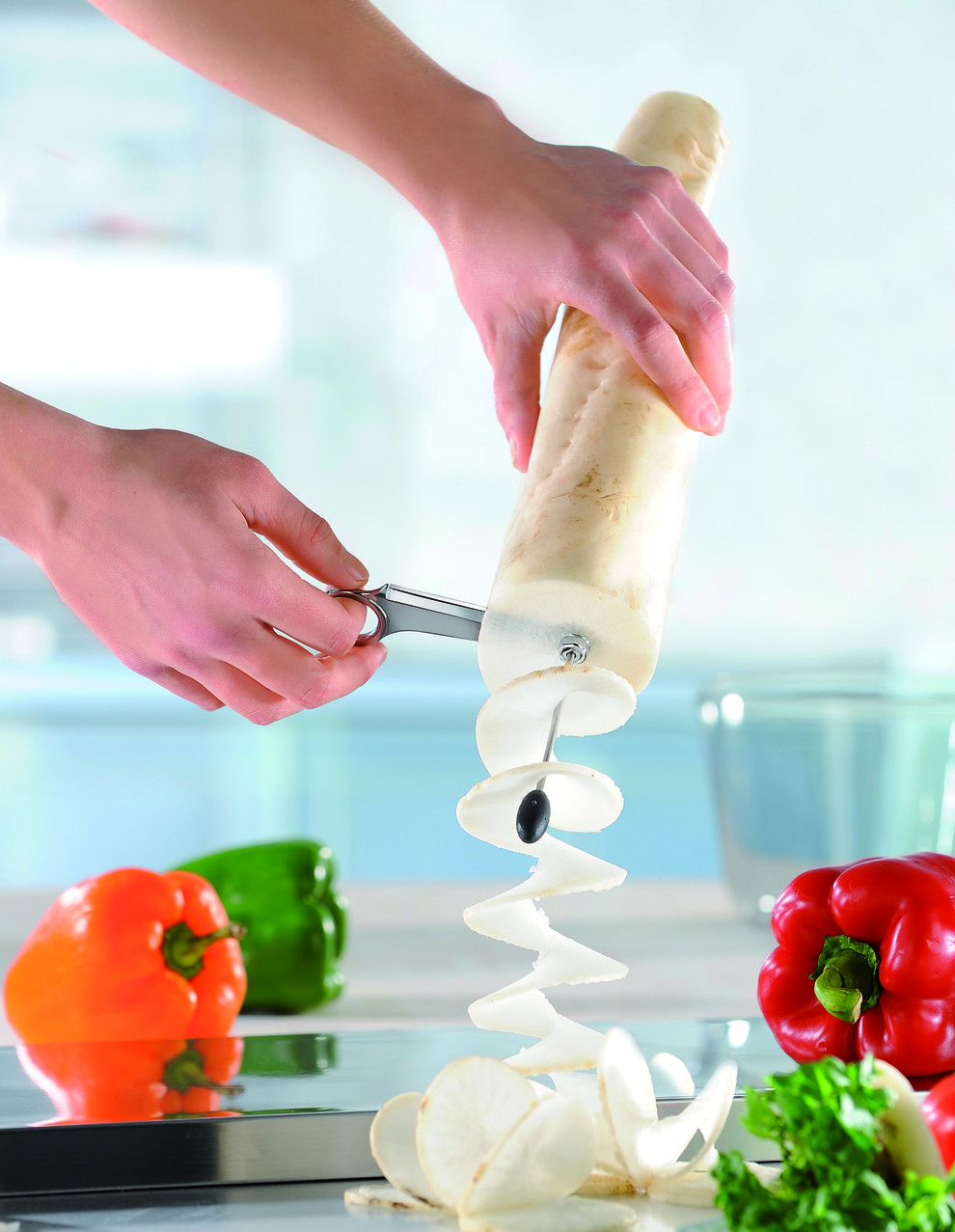 Grâce à la tige et au protecteur de doigts, découpez rapidemment en toute sécurité de jolies spirales décoratives. Ce coupe-raifort convient également pour les concombres, carottes, pommes de terre et autres aliments fermes.